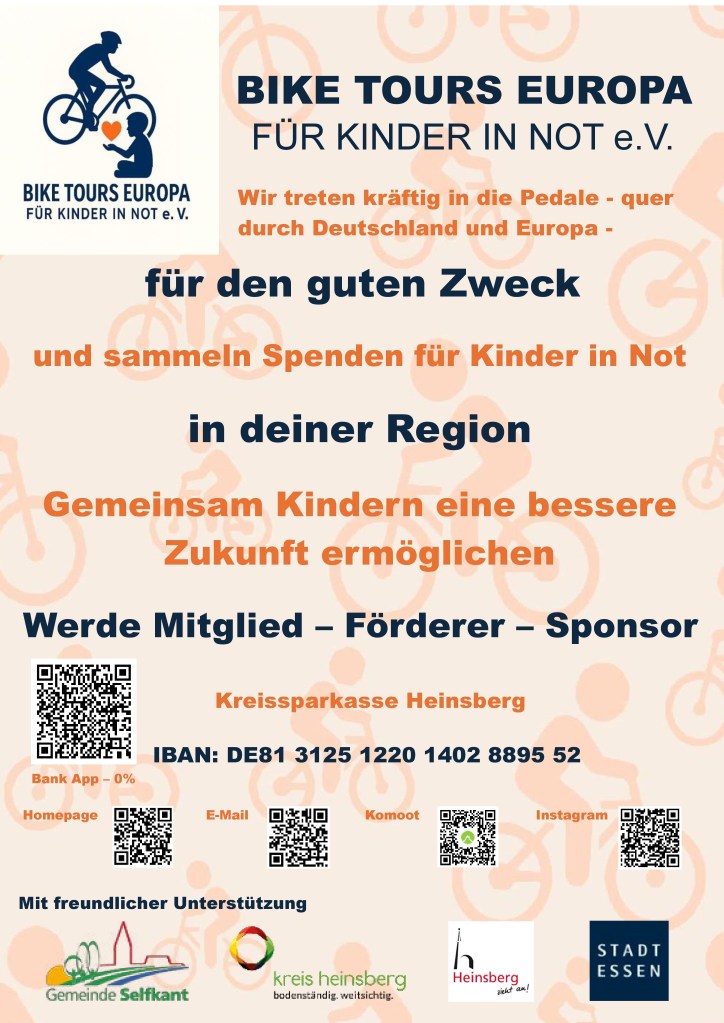 Neben der Suche nach weiteren Mitgliedern und Spender_innen suchen wir natürlich auch Sponsor_innen und Förderer, um die laufenden Kosten unseres Vereins und allem organisatorischen im Hintergrund zu decken. Meldet euch dazu einfach bei Willi Corsten unter der Telefonnummer +49 162 8878454 oder per Mail unter wjcbiketours@gmail.com. Die IBAN bei der KSK Heinsberg des separaten Kontos für Sponsoren und Förderer, welches unabhängig vom Spendenkonto läuft, lautet DE81 3125 1220 1402 8895 52. Mit dem QR Code kommt man über die Banking-App direkt an die Daten.
